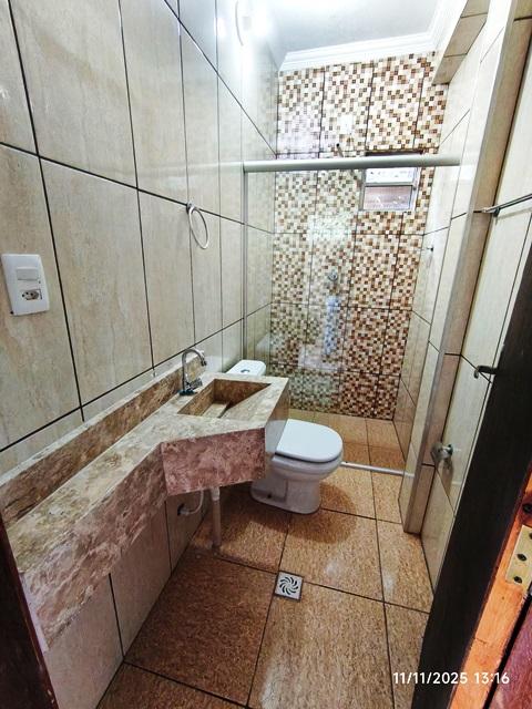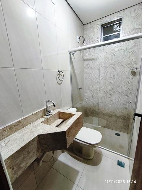 * Banheiro social todo revestido em cerâmica com box em vidro temperado.
